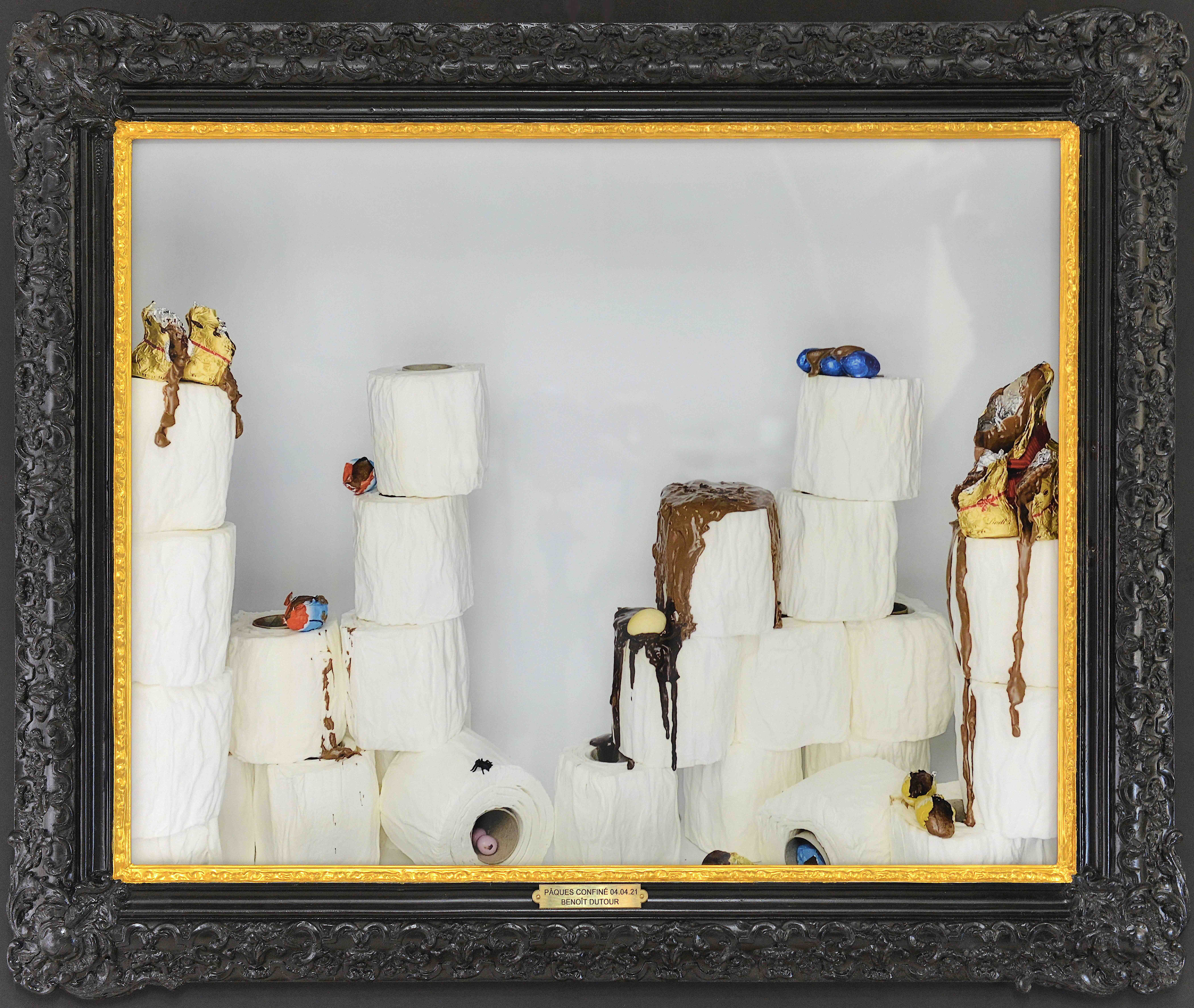 « Ce tableau de Benoît Dutour met en scène des chocolats de Pâques  aux dorures rutilantes installés en majesté sur des rouleaux de papier toilette en guise de piédestal. Si les premiers sont habituellement chassés à cette période pascale, les seconds le sont bien moins en principe… et pourtant ! Rappelons-nous au printemps dernier les scènes de razzia, les images télévisuelles capturant le vide des rayons dans les supermarchés ou s’attardant sur les chariots qui débordaient de ce papier devenu soudain si convoité, si précieux, aux côtés de la farine et des pâtes. Souvenons-nous des appels à la modération quelque peu ubuesques lancés à des consommateurs trop prévoyants : car on hésitait, il fallait se montrer raisonnable et ne pas trop se servir, mais on en prenait quand même un peu plus… au cas où…